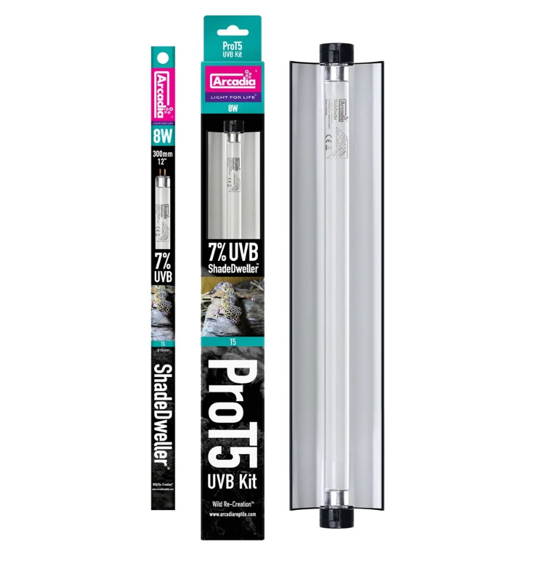 Az Arcadia Pro T5 UVB Kit ShadeDweller egy professzionális UVB fénycső és reflektor készlet, mely kimondottan árnyékos vagy félárnyékos környezetben élő hüllők igényeihez lett fejlesztve. A 7%-os UVB kibocsátás optimális D3-vitamin szintézist biztosít, amely létfontosságú a csontozat egészségéhez és a megfelelő anyagcsere-folyamatokhoz. A csomagban található reflektor hatékonyan irányítja és növeli a sugárzás hatékonyságát, segítve a terráriumi környezet természetes napfényviszonyainak szimulálását.