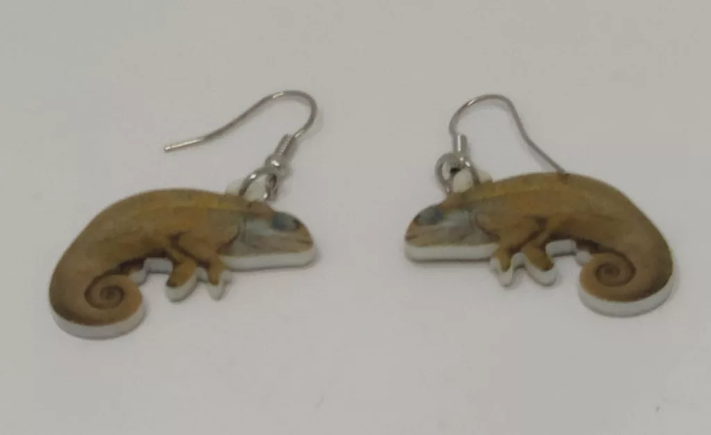 Ez a vidám és különleges kaméleon formájú fülbevaló tökéletes választás azok számára, akik szeretik az állatmintás, játékos ékszereket. A fülbevalók könnyű műanyagból készültek, így egész napos viseletre is kényelmesek. A kaméleon színes, élethű mintázata garantáltan mosolyt csal az arcokra, és vonzza a tekinteteket.