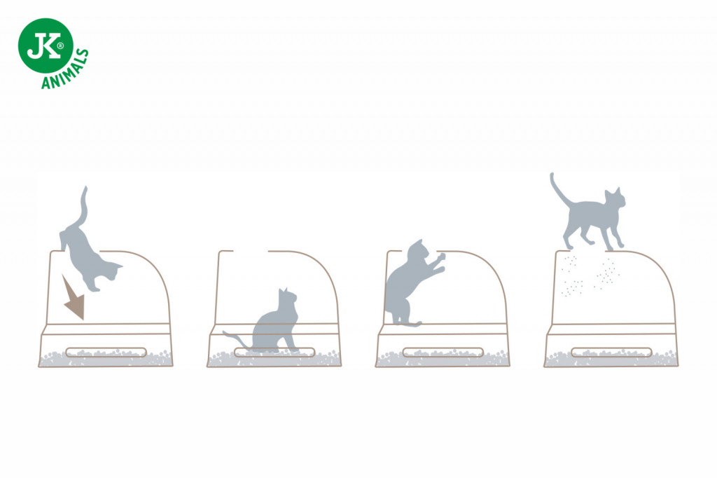 A felső bejáratos dizájn egyik legnagyobb előnye, hogy minimálisra csökkenti az alom széthordását: a cica kijutáskor a tetején lévő perforált felületen áthaladva lerázza tappancsairól az alomdarabkákat, így az alom a dobozban marad, nem pedig a padlón köt ki. A magas falak meggátolják a kaparás közbeni kiszóródást és a szagok terjedését is.