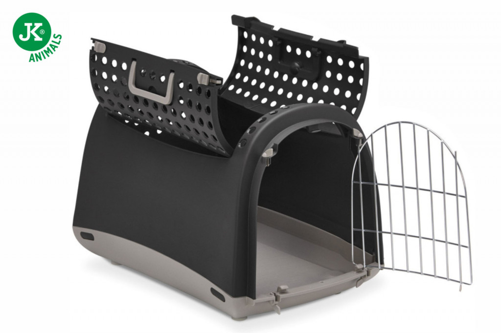 A különleges CABRIO kialakítás lehetővé teszi a tető teljes felnyitását vagy eltávolítását, ami nagyon megkönnyíti a ki- és beemelést, különösen állatorvosi látogatások során. Ez a funkció csökkenti a stresszt, mivel nem kell a cicát vagy a kutyát a szűk előajtón átkényszeríteni. Az elülső rész rácsos, jól szellőző és biztonságosan zárható, így a kisállat szállítás közben is biztonságban és kényelemben van.