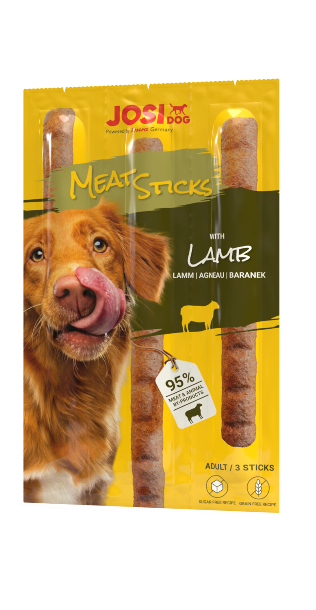 A JosiDog Meat Sticks Lamb egy ízletes, bárányhús alapú húsfalat, amely magas állati fehérjetartalmának köszönhetően támogatja az izmok fenntartását és a vitalitást. A bárány, mint könnyen emészthető fehérjeforrás, kíméli az emésztőrendszert, ezért ez a jutalomfalat érzékeny gyomrú kutyáknak is ideális választás.