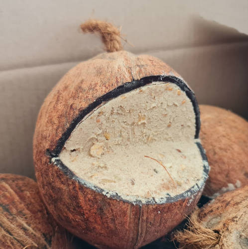 A Kókusz 3/4-es töltött téli madáreleség egy praktikus és esztétikus madáretető-megoldás, amely egyszerre szolgál táplálékkal és dekorációval. A termék fő eleme a kókuszdió (héj), amelyet félig megtöltenek zsiradékkal, magkeverékkel – így a madarak számára könnyen elérhető és kedvelt táplálék. Hideg napokon, amikor a természetes táplálék korlátozott, ez a típusú kiegészítő etetés segíthet a madarak energiabevitelében.