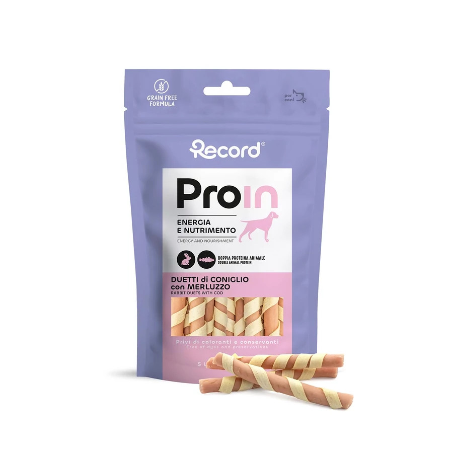 RECORD ProIn Jutalomfalat Kutyáknak Duetti Nyúl és Tőkehal 75 g. A ProIn egy- vagy kettős állati fehérjét tartalmazó kutyajutalomfalatok magas biológiai értékű fehérjékkel készülnek, prémium húsokból, például kacsából, csirkéből, tonhalból, tőkehalból, nyúlból és bárányból. Ezek a rendkívül jól emészthető fehérjeforrások támogatják az erős, egészséges izmok fejlődését és fenntartását, valamint elősegítik a regenerálódást fizikai aktivitás után. A receptet különféle szuperélelmiszerek – például áfonya, spenót, alma, lazac és chiamag – egészítik ki, amelyek természetes módon gazdagok antioxidánsokban, vitaminokban és rostokban, erősítik az immunrendszert és hozzájárulnak az általános jólléthez. Az energiát lassú felszívódású szénhidrátok biztosítják, mint az édesburgonya és a burgonyakeményítő, valamint gyümölcsökből, zöldségekből és olyan szuperélelmiszerekből származó tápanyagok, mint a goji bogyó. Ezek az összetevők folyamatos, kiegyensúlyozott energiaszintet biztosítanak, csökkentik az éhséget és mérséklik a vércukorszint-ingadozásokat. Az egészséges zsírok – például a halolaj és a chiamag – kiváló kalóriaforrást és hosszan tartó teltségérzetet adnak, köszönhetően annak, hogy képesek megkötni a folyadékot és fokozatosan felszabadítani az energiát. Ezeknek a tulajdonságoknak köszönhetően a ProIN jutalomfalatok javítják az aktív vagy sportoló kutyák teljesítményét, azonnali energiát és fontos tápanyagokat biztosítanak, pótolják az esszenciális vitaminokat és ásványi anyagokat, valamint elősegítik a bélrendszer egészségét a természetes rostok és a jól emészthető fehérjék egyensúlyának köszönhetően. Az összetevők minősége és a mesterséges adalékanyagok hiánya tisztaságot és biztonságot garantál, míg a gabonamentes és gluténmentes formula a legérzékenyebb kutyák számára is megfelelő. Minden egyes jutalomfalat ellenőrzött, lassú és gondos gyártási folyamat eredménye, amely magas minőségi követelményeket és a kutyád számára ellenállhatatlan ízt biztosít.