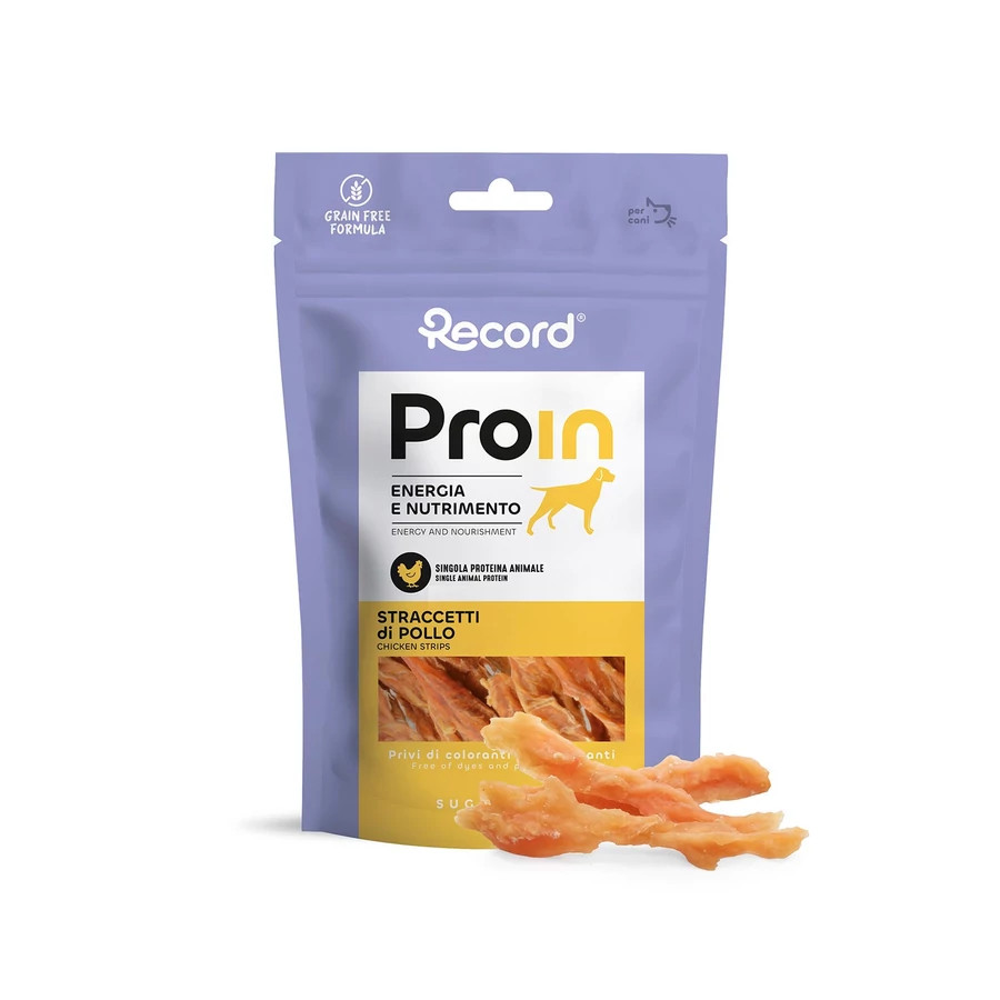 RECORD ProIn Jutalomfalat Kutyáknak Straccetti Csirkés 75 g. A ProIn egy- vagy kettős állati fehérjét tartalmazó kutyajutalomfalatok magas biológiai értékű fehérjékkel készülnek, prémium húsokból, például kacsából, csirkéből, tonhalból, tőkehalból, nyúlból és bárányból. Ezek a rendkívül jól emészthető fehérjeforrások támogatják az erős, egészséges izmok fejlődését és fenntartását, valamint elősegítik a regenerálódást fizikai aktivitás után. A receptet különféle szuperélelmiszerek – például áfonya, spenót, alma, lazac és chiamag – egészítik ki, amelyek természetes módon gazdagok antioxidánsokban, vitaminokban és rostokban, erősítik az immunrendszert és hozzájárulnak az általános jólléthez. Az energiát lassú felszívódású szénhidrátok biztosítják, mint az édesburgonya és a burgonyakeményítő, valamint gyümölcsökből, zöldségekből és olyan szuperélelmiszerekből származó tápanyagok, mint a goji bogyó. Ezek az összetevők folyamatos, kiegyensúlyozott energiaszintet biztosítanak, csökkentik az éhséget és mérséklik a vércukorszint-ingadozásokat. Az egészséges zsírok – például a halolaj és a chiamag – kiváló kalóriaforrást és hosszan tartó teltségérzetet adnak, köszönhetően annak, hogy képesek megkötni a folyadékot és fokozatosan felszabadítani az energiát. Ezeknek a tulajdonságoknak köszönhetően a ProIN jutalomfalatok javítják az aktív vagy sportoló kutyák teljesítményét, azonnali energiát és fontos tápanyagokat biztosítanak, pótolják az esszenciális vitaminokat és ásványi anyagokat, valamint elősegítik a bélrendszer egészségét a természetes rostok és a jól emészthető fehérjék egyensúlyának köszönhetően. Az összetevők minősége és a mesterséges adalékanyagok hiánya tisztaságot és biztonságot garantál, míg a gabonamentes és gluténmentes formula a legérzékenyebb kutyák számára is megfelelő. Minden egyes jutalomfalat ellenőrzött, lassú és gondos gyártási folyamat eredménye, amely magas minőségi követelményeket és a kutyád számára ellenállhatatlan ízt biztosít.