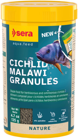 A Sera Cichlid Malawi Granules egy speciális összetételű főeleség, amely nagy mennyiségben tartalmaz értékes algákat (Spirulina platensis). Mivel a kelet-afrikai sügérek természetes környezetükben főként az algaszőnyeget és a benne élő apró szervezeteket fogyasztják, ez a táp magas növényi rosttartalmával támogatja az érzékeny emésztőrendszerük egészségét.
