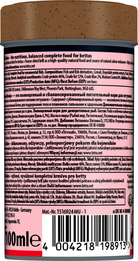 A Tetra Betta Mini Flakes egy teljes értékű főeleség, amelyet a sziámi harcoshalak speciális táplálkozási igényeinek figyelembevételével alkottak meg. Mivel a betták a természetben főként rovarokkal és lárvákkal táplálkoznak, ez a táp magas arányban tartalmaz kiváló minőségű állati fehérjéket. A hozzáadott krill és garnéla nemcsak ízletessé teszi az eledelt, hanem természetes karotinoidokban is gazdag, ami kiemeli a halak ragyogó színeit.