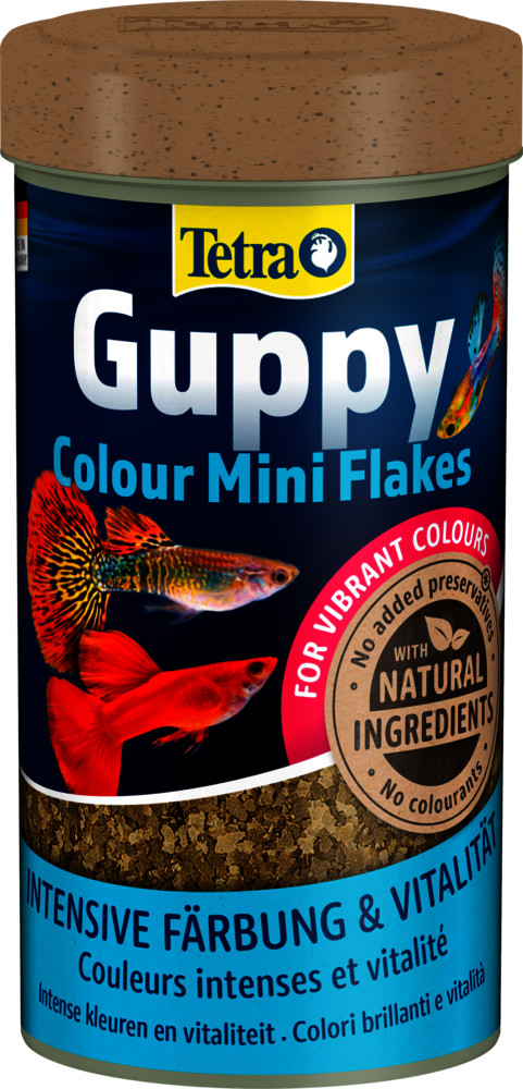 A Tetra Guppy Colour Mini Flakes a népszerű guppi táp továbbfejlesztett, extra színfokozókkal ellátott változata. A receptúra magas koncentrációban tartalmaz természetes színanyagokat (karotinoidokat), amelyek már néhány hét rendszeres etetés után láthatóan mélyítik a halak vörös, sárga és narancssárga színeit, miközben ragyogó fényt kölcsönöznek a pikkelyeknek.