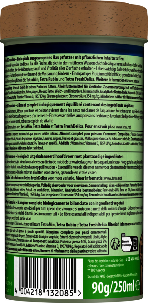 A Tetra Phyll Granules egy teljes értékű főeleség, amelyet kifejezetten a növényi táplálékot preferáló díszhalak (például elevenszülők, növényevő sügérek és algázók) igényeihez fejlesztettek ki. A granulátum magas arányban tartalmaz értékes növényi rostokat és alapvető tápanyagokat, amelyek elengedhetetlenek a természetes emésztési folyamatok támogatásához.