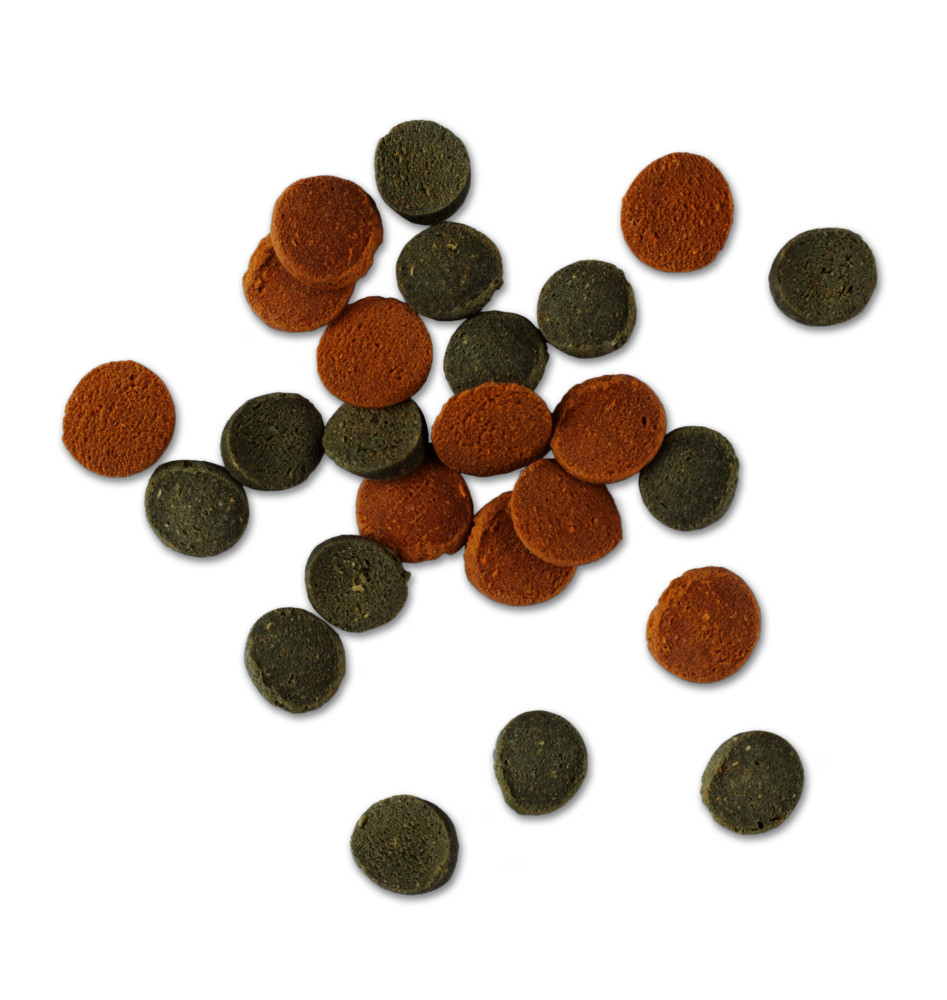 - Összetétel: hal és halszármazékok, növényi fehérjekivonatok, gabonafélék, növényi melléktermékek, puhatestűek és rákfélék, élesztők, algák (Spirulina 1,5%)