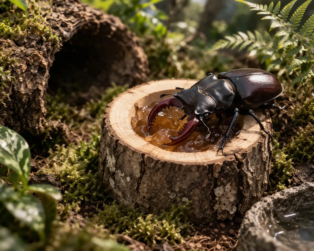 Helyezze az etetőt a terrárium egy stabil pontjára. A bogár- vagy hüllőzselé tetejét távolítsa el, majd illessze a tégelyt a fa furatába. Tisztításkor kerülje az erős vegyszerek használatát, inkább kefével és kevés vízzel távolítsa el a szennyeződéseket.