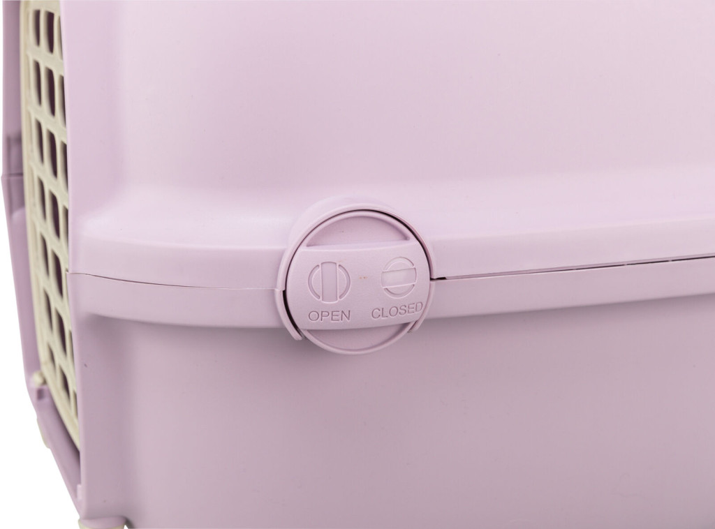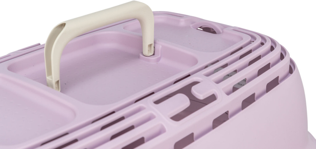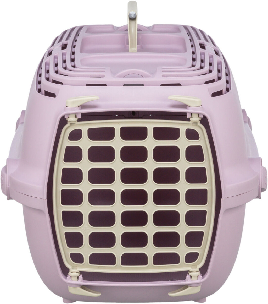 A strapabíró műanyag kialakítás tartós és könnyen tisztítható, így higiénikus választás a mindennapokra. A szellőzőnyílások több oldalon helyezkednek el, így biztosítva a megfelelő levegőáramlást és a kedvenc komfortját utazás közben. Az elején található rácsos ajtó stabilan záródik, és biztonságos elhelyezést nyújt, miközben lehetőséget ad a kilátásra is.