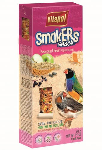 Ez a kiegészítő eledel kifejezetten pintyfélék számára készült, hogy jutalomfalatként vagy etetéskiegészítésként használható legyen. A csomag két darab, sült magrúd formájú snacket tartalmaz, melyek természetes gyümölcsdarabokkal – például alma, málna, ribizli – és válogatott magvakkal készültek.