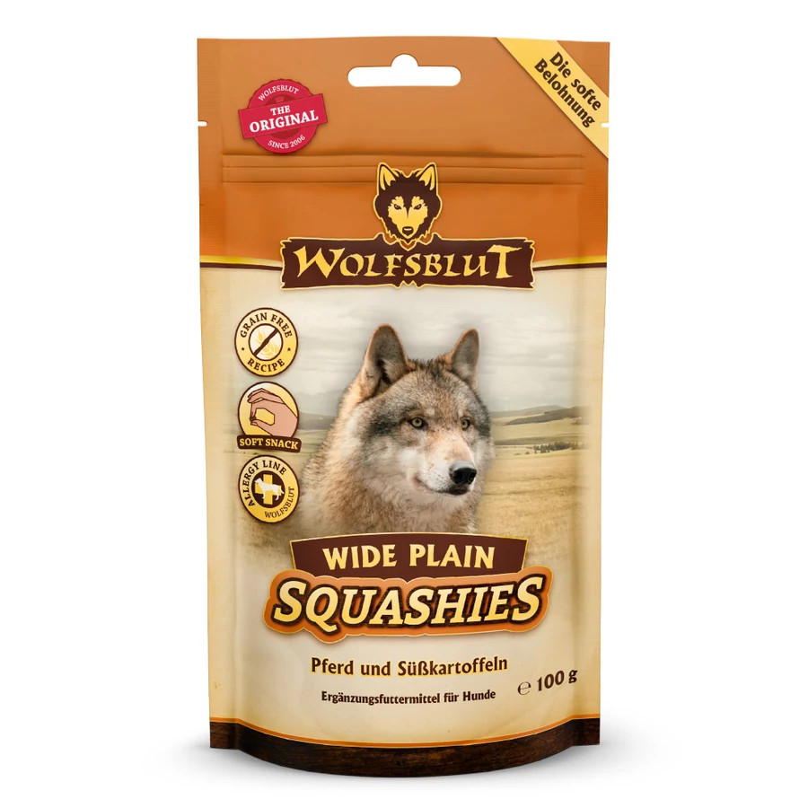 A receptúra édesburgonyát és szuperélelmiszereket tartalmaz, melyek támogatják az immunrendszert és az emésztést. Mentes cukortól, szójától, mesterséges adalékanyagoktól és ízfokozóktól. A Wide Plain Squashies kiválóan kiegészíti a Wolfsblut tápokat, segítve a fajnak megfelelő, kiegyensúlyozott étrendet. Összetétel: ló 41% (ebből friss ló 24%, szárított ló 13%, lózsír 4%), édesburgonya 18%, növényi glicerin, burgonya, burgonyafehérje, kakukkfű, majoránna, oregánó, petrezselyem, zsálya, ásványi anyagok, édeskömény, lenmag, paszternák, moringa, csicseriborsó, paradicsom, csalán, galagonya, gyermekláncfű, ginzeng. Analitikai összetevők: nyersfehérje 18,5%, nyerszsír 7%, nyershamu 14%, nyersrost 1,5%, nedvesség 18%, energiatartalom 287 kcal/100 g.