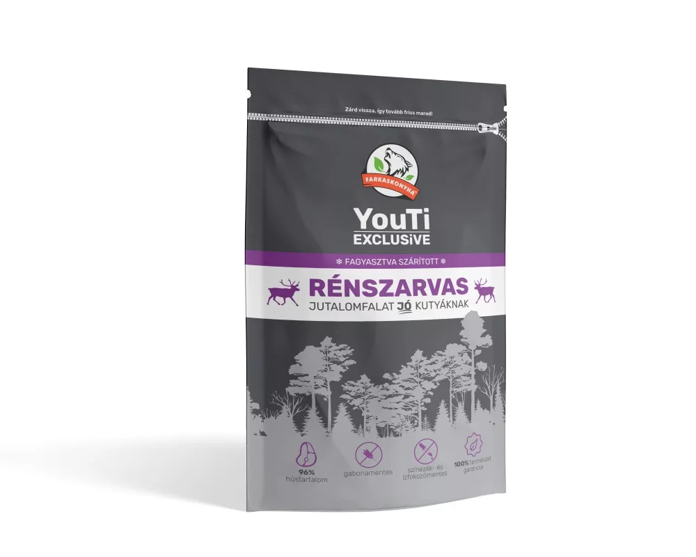 A YouTi Exclusive Rénszarvas jutalomfalat egy különleges, prémium kategóriás snack, amelyet természetes rénszarvashúsból készítenek, kíméletes szárítási technológiával.